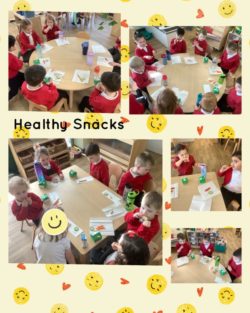 Our healthy snacks this week were apples, pears, cucumber, pepper, carrot and breadsticks. We talked lots about making healthy choices. Delicious!