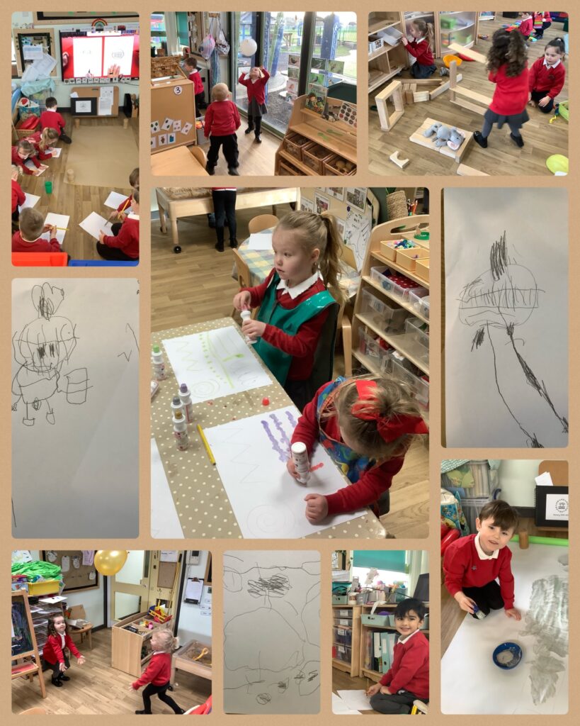 This week we have been focussing on nursery routines and independence. We welcomed some new children, so some of the children who have been in nursery for longer have been showing them around and helping them to settle in. The children also helped Mrs Huggins paint a huge knight for World Book Week. We decided to follow Art Hub for Kids and draw our own! We love following along with Art Hub for Kids, it’s a great skill even for little ones; there are lots of simple ones to follow that are great for teaching us to draw and for adding detail to our drawings.