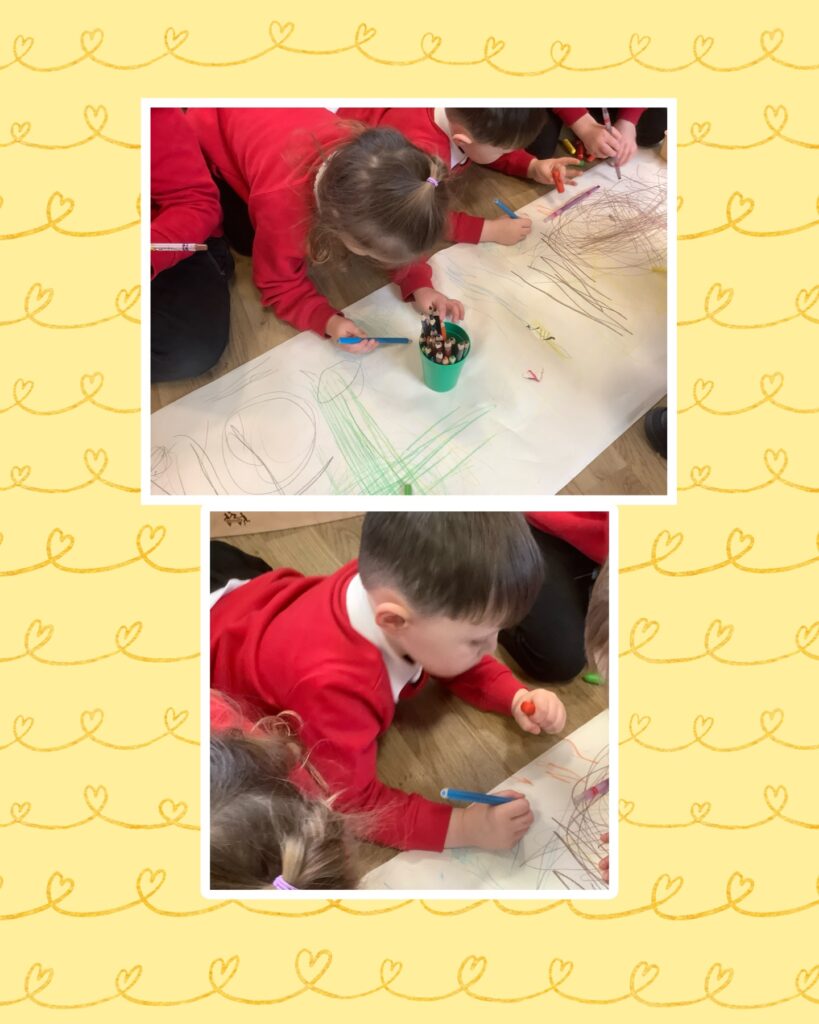 We are encouraging lots of mark making with different tools like, chalk, crayons, pencils, pens. Please encourage your child to have some mark making time at home too.