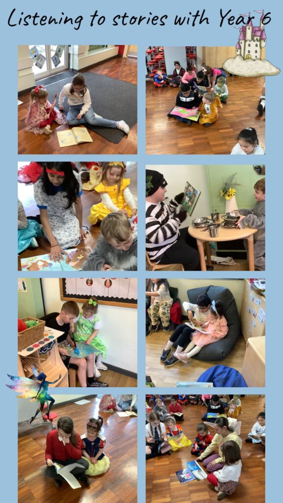 What an amazing week we have had in school and in class! This week, the school was transformed into a Fairytale forest, with different characters from our favourite stories hidden around the school. The children listened to ‘Jack and the Beanstalk’ and our home area was changed into Jack’s cottage with a beanstalk taking over the classroom, some children created their own beanstalks with different materials. In maths, the children had to count and order numbers to 8, they stacked and ordered green cubes like beanstalks. Outside, the children enjoyed the sunshine and loved playing with the water, finding new materials in the construction area and we also planted some ‘Magic beans’ to grow beanstalks. The children also had a story hunt outside. It was fantastic to see the lovely ‘Book in a Box’ creations – Well Done to Freddie who won the competition entry for Reception. Mr Jackson (dressed as The Gingerbread Man) and Mrs Tweddle (dressed as one of the 3 little pigs) popped into Reception at the end of the week to read a story about their character. Then the Year 6 children visited in the afternoon to read more stories. Excellent oracy skills developed this week with the children, each one of them loved listening to different stories and talking about the characters.