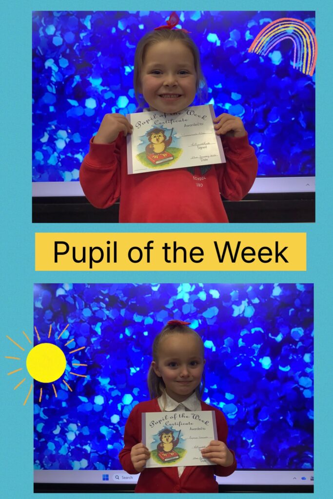 In Sunshine group, Pupil of the Week goes to Sophia, for doing well in her phonics this week. Well Done!