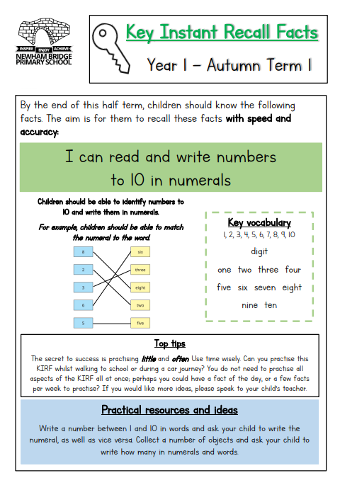 Each day in Maths we practise our daily counting and KIRFs (Key Instant Recall Facts). Your child has been given the following leaflet which explains what we hope your child could to do by the end of this half term and how you can help your child achieve this. Thank you for your continued support.