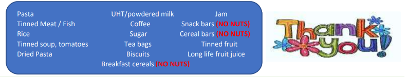 We will be holding a Harvest assembly in school on Thursday 16th October. We will be accepting any donations of tinned, dried, packaged goods – NO NUTS in school to support our community foodbanks until Friday 17th October. Items may include any of the following: